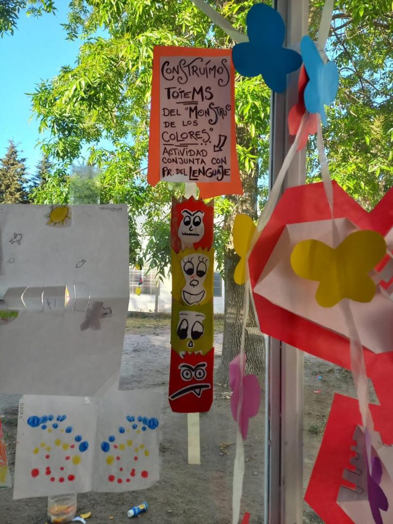 La seño Noelia, de Plástica, es una de las manos que guían y acompañan estas obras. Y la seño Naty colaboró mucho en el armado de la muestra.