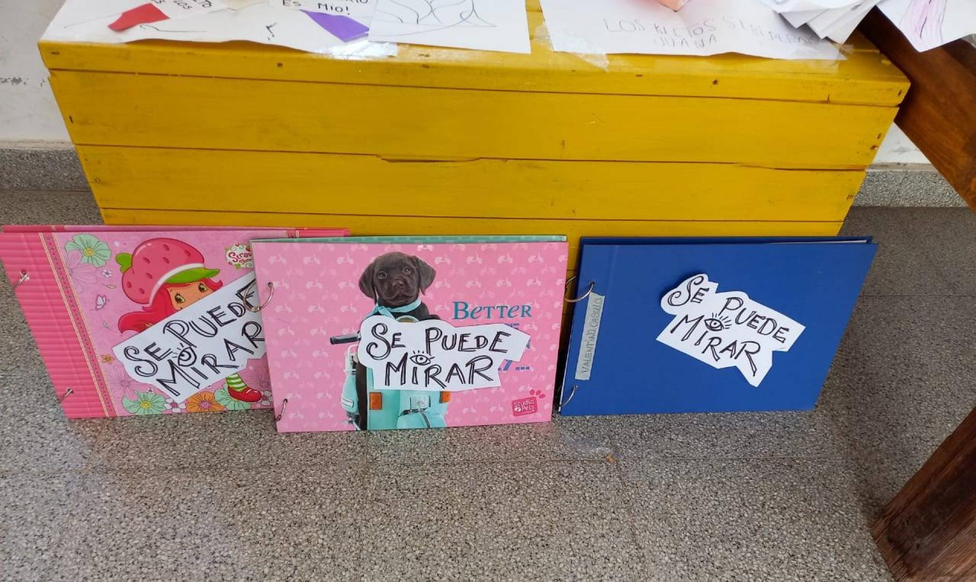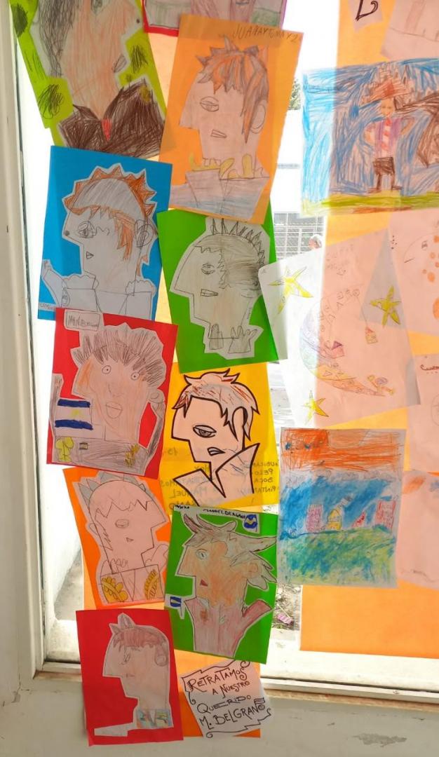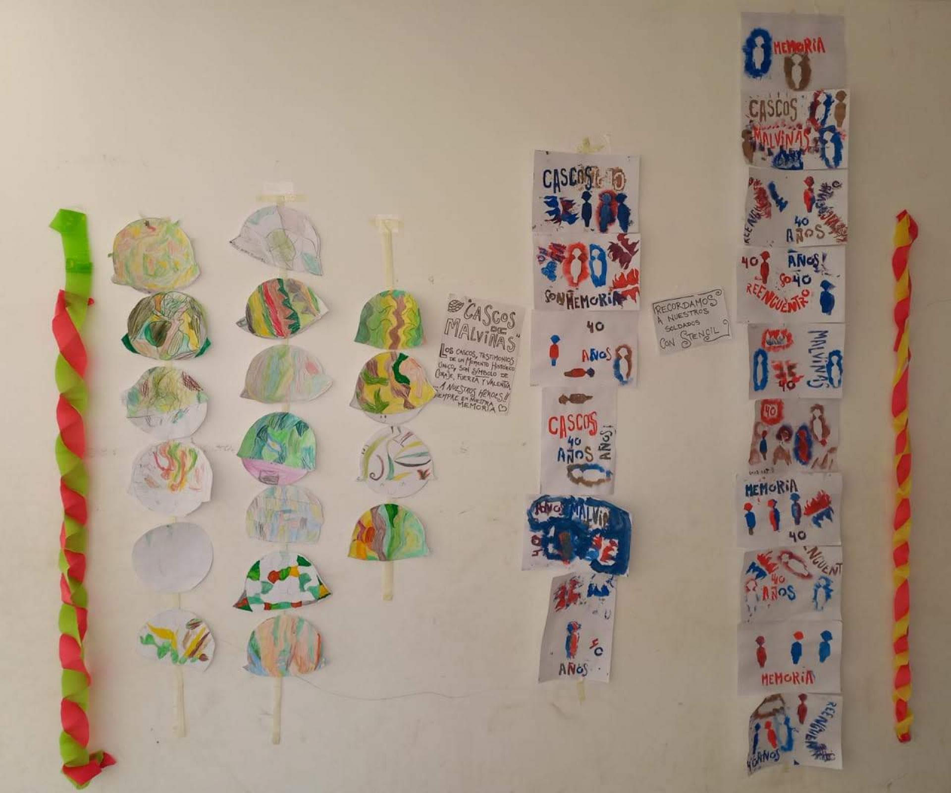 Pueden encontrar tarjetas con pop up, máscaras con luces y una investigación sobre Malvinas, que se convierte en un gran homenaje hecho por los chicos y las chicas de primero y segundo con stencils sobre la idea de los cascos como símbolo.